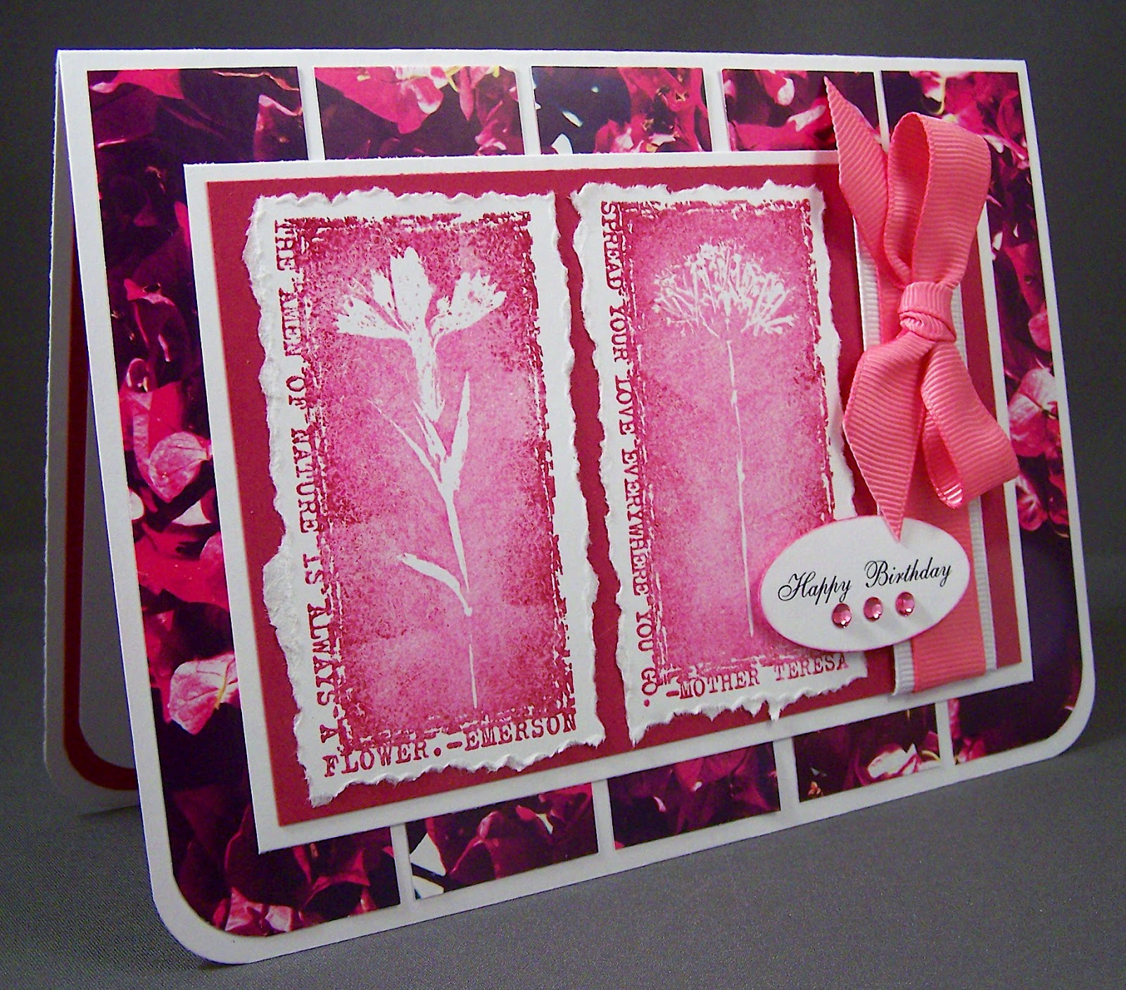 Ink/Coloring: Pink and Red pigment ink with clear embossing (ink up stamp with lighter color then add darker color around the edges before stamping).